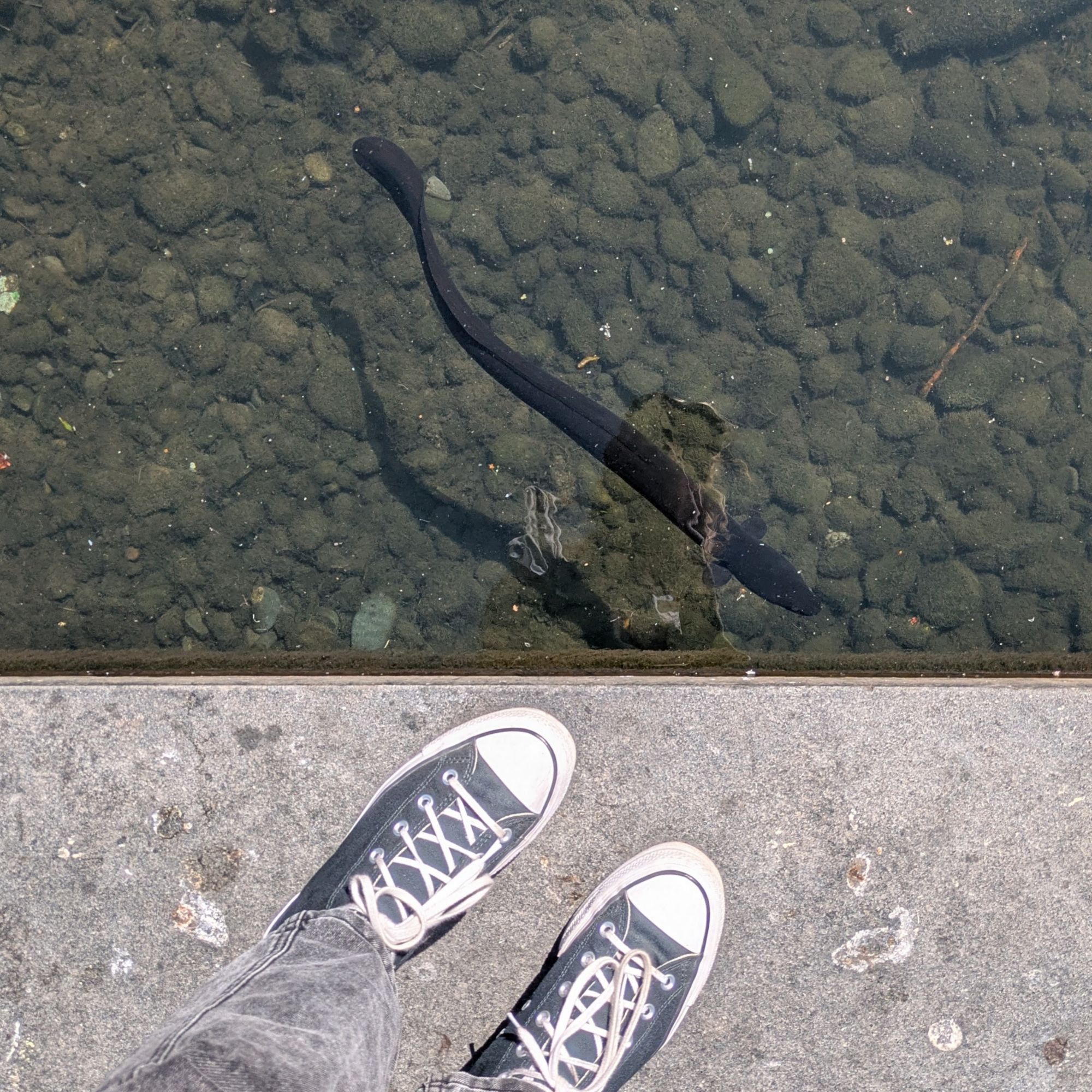 We follow the path to take us to the edge of the Avon River / Ōtākaro where we get some sightings of longfin eels / tuna up close (see the featured image)